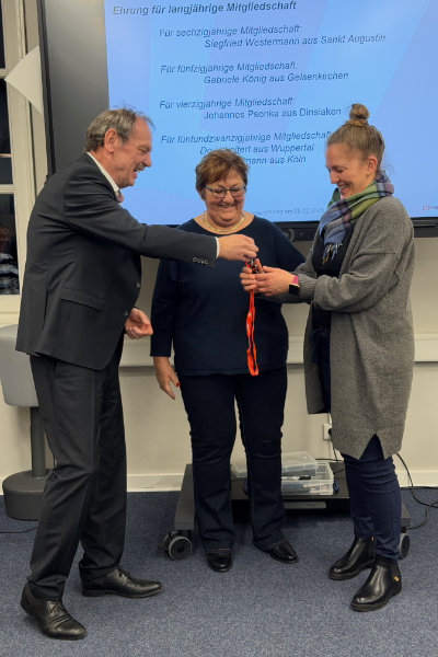 Der neu gewählte Präsident überreicht der neuen Geschäftsstellenleiterin symbolisch den Schlüssel der Geschäftsstelle. – Die Jubilare